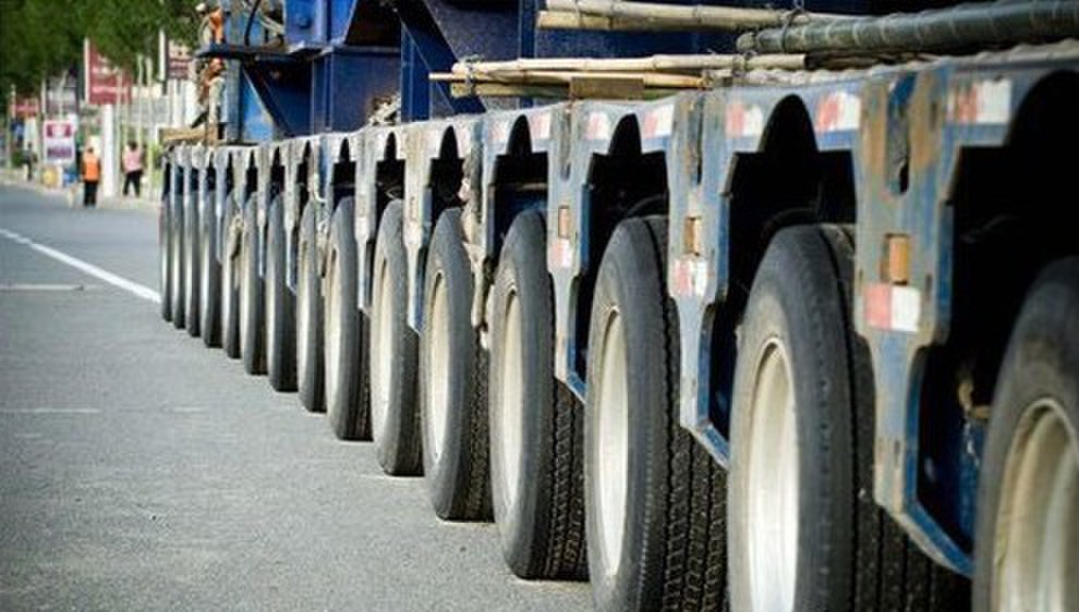 普通小車4個,貨車8到12個,6軸的半掛車最多也就22個輪子。但據(jù)報道此車有230個輪子,為兩節(jié)4線13軸的雙輪共計108個輪子,加上兩個牽引頭共計22個輪子(應(yīng)該是一個6X4的一個8X4的),一共230個輪子。