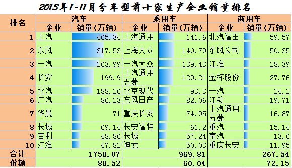自主乘用車方面,長城撥得頭籌。商用車方面性價比較高的北汽福田和東風(fēng)汽車名列前茅。這反映出我國的汽車市場還是以適用實惠為主,性價比為王。下面是前十一月的實際數(shù)據(jù):