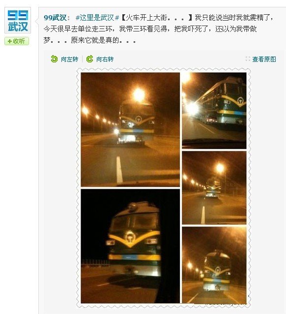 姚笛告訴記者,他家住漢口,在江夏某產(chǎn)業(yè)園一印務公司工作,昨日凌晨由于失眠,干脆早起上班。4時許,姚笛開車行駛在三環(huán)上,由武漢火車站往光谷方向,突然看到一個火車頭“迎面而來”(右圖),“我立刻踩剎車,近距離用手機拍下這一幕”。這條微博在網(wǎng)上被迅速轉(zhuǎn)發(fā),截止昨日發(fā)稿,共被轉(zhuǎn)發(fā)1056次,評論190條。