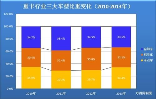 隨著牽引銷量增長帶來的比重擴(kuò)大,重卡行業(yè)的比重結(jié)構(gòu)也發(fā)生一定變化。在2013年,牽引車在重卡市場的比重增長了4.7%,從2012年的29.7%增加到34.4%,使其市場份額從最末位上移至首位,一改2011年、2012年連續(xù)兩年占比最小的弱勢。而自卸車市場份額下降1%(從34.5%到33.5%),載貨車市場份額則下降了3.7%(從35.8%到32.2%)。這從側(cè)面也說明甩掛運(yùn)輸?shù)玫竭M(jìn)一步推廣,牽引車取代了部分載貨車市場需求。