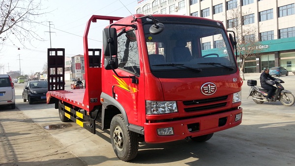 平板運輸車是專門用來拉挖掘機鉤機叉車等大型機械設(shè)備和工程機械的專用汽車。區(qū)別于一般的貨車載貨載重分布均勻的特點,拿平板運輸車最常見的用途拉挖掘機來說,挖掘機上下時必須要爬梯才能方便上下。挖掘機上下的時候?qū)ε捞莺驼嚨臎_擊非常大,所以必須要求爬梯的強度非常強才能經(jīng)久耐用。爬梯一般是用手動舉起和放下,所以平板運輸車廠家湖北俊龍專用汽車有限公司的平板運輸車產(chǎn)品都在爬梯上裝上兩根彈簧,而且對彈簧、彈簧支架的尺寸和位置通過精確計算設(shè)計制作,一個人就可以很方便的舉起和落下。平面承重部分因為挖掘機??康奈恢檬侵饕撝貐^(qū),我們在承重區(qū)加強方筒鋼鋪放密度,確保經(jīng)久耐用。目前是平板運輸車銷售的旺季,也正時值柴油車尾氣排放國三和國四切換的時候,很多平板運輸車用戶苦于沒有合適的國四平板運輸車產(chǎn)品,下面平板運輸車廠家湖北俊龍專用汽車有限公司為您推薦一款一汽解放出品底盤的平板運輸車產(chǎn)品,具體參數(shù)如下: