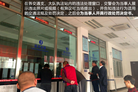 2.在處理違章窗口,辦事交警會讓當(dāng)事人查看違法照片或視頻,并告知當(dāng)事人相關(guān)違章適用的法律條款以及處罰決定。