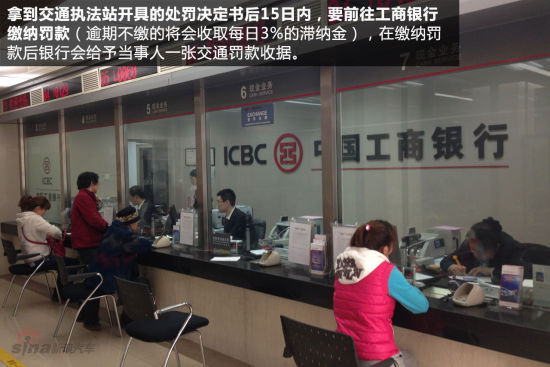 4.拿到行政處罰決定書后15日內(nèi),到任意一家工商銀行繳納罰款即可。(到期不繳納罰款的,每日按罰款金額的3%產(chǎn)生滯納金,不過滯納金總額不會超過罰款金額)繳納罰款后,銀行會給予當(dāng)事人交通罰款收據(jù)一張。