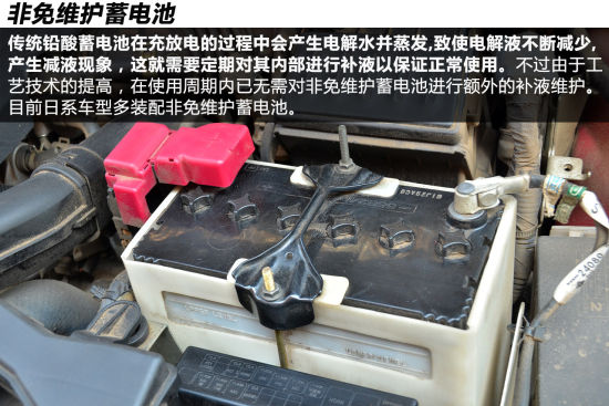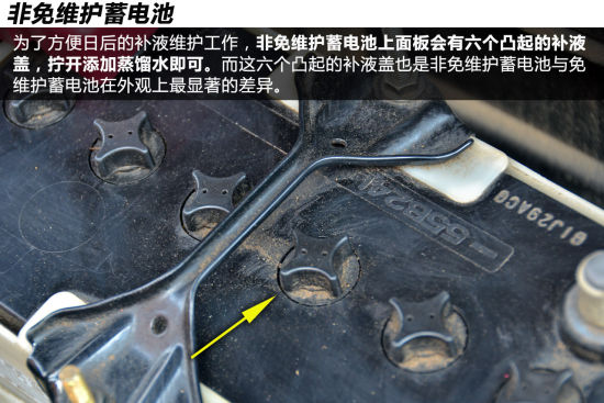 也就是傳統(tǒng)的鉛酸蓄電池,其成本相對較低,而由于其在日常使用過程中會發(fā)生減液(電解液)現(xiàn)象,因此還需要定期向其內(nèi)部添加補(bǔ)充液(蒸餾水)以保證日常使用。為了方便添加蒸餾水,非免維護(hù)蓄電池上部會有六個(gè)凸起的補(bǔ)液蓋,而這也是非免維護(hù)蓄電池與免維護(hù)蓄電池在外觀上最為明顯的差別。不過由于現(xiàn)代制造工藝技術(shù)的提高,非免維護(hù)蓄電池在其使用周期內(nèi),一般已無需進(jìn)行額外的維護(hù)(添加蒸餾水),而且其壽命也已與免維護(hù)蓄電池?zé)o異。目前,日系品牌比較普遍的裝配有非免維護(hù)蓄電池。