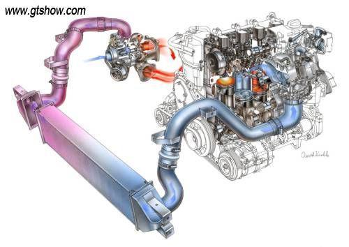 二、增壓中冷技術(shù)改善燃燒的另一要素——氧氣的利用率,增大進氣量,有助于減少廢氣排放和提高燃油經(jīng)濟性。增壓中冷(又稱中冷增壓)是由增壓器和中冷系統(tǒng)組成。通過利用發(fā)動機排出的廢氣慣性沖力來推動渦輪室內(nèi)的渦輪,渦輪有帶動同軸的葉輪,葉輪壓送由空氣濾清器送來的空氣,使之增壓進入氣缸。當發(fā)動機轉(zhuǎn)速增快,廢氣加速排出,帶動渦輪轉(zhuǎn)速增快,葉輪就壓縮更多的空氣進入氣缸,形成同步協(xié)調(diào)作用,最終增加發(fā)動機的輸出功率。