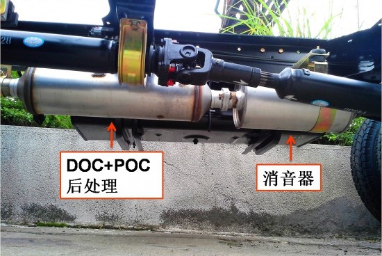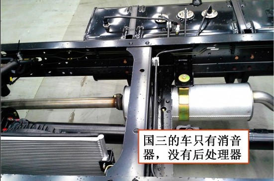 三、找DOC+POC后處理系統(tǒng)。這是最容易辨識(shí)的標(biāo)志,只需要蹲下來(lái)從車底看排氣管上是否有兩個(gè)柱形罐狀裝置。國(guó)III車只有一個(gè),即消音器;而國(guó)IV車則有兩個(gè),其一為消音器,另一為DOC+POC后處理系統(tǒng)。