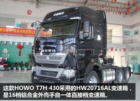 這款HOWO T7H 430采用重汽(HW)變速箱,額定輸入2000N·m(20),重型車系列(7),16個前進檔(16),AMT手自一體(A),鋁合金外殼(L)。