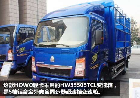 這款HOWO 輕卡采用重汽(HW)變速箱,額定輸入扭矩350N·m,輕型車系列(5),5個前進檔(05),全同步器(T),超速檔(C),鋁合金外殼(L)。