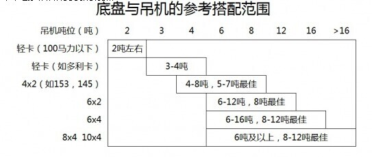 對(duì)于底盤與吊機(jī)的匹配,因?yàn)橛龅降墓r和需求各不相同,還沒有一個(gè)確切的范圍,根據(jù)以往的購車經(jīng)驗(yàn),100馬力以下輕卡,如東風(fēng)小霸王可以安裝2噸左右的吊機(jī);東風(fēng)多利卡類型的輕卡可以安裝3-4噸的吊機(jī);145,153級(jí)別的4x2中卡可以安裝4-8噸的吊機(jī),5-7噸吊機(jī)為最佳(起重與運(yùn)輸能力平衡);6x2底盤可以安裝6-12噸吊機(jī),8噸吊機(jī)為最佳搭配;6x4底盤可安裝6-16噸吊機(jī),8-12噸為最佳;8X4底盤較6x4底盤還可安裝更大噸位的底盤。