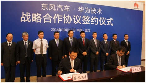 2014年10月17日,東風(fēng)汽車公司與華為技術(shù)有限公司在武漢簽署戰(zhàn)略合作協(xié)議,雙方將在汽車電子、智能汽車、IT/ICT信息化建設(shè)等領(lǐng)域,協(xié)同創(chuàng)新,展開(kāi)跨界合作。這是東風(fēng)主動(dòng)把握移動(dòng)互聯(lián)網(wǎng)的新機(jī)遇,積極開(kāi)展模式創(chuàng)新的重大戰(zhàn)略安排,也是華為拓寬業(yè)務(wù)領(lǐng)域的關(guān)鍵舉措。