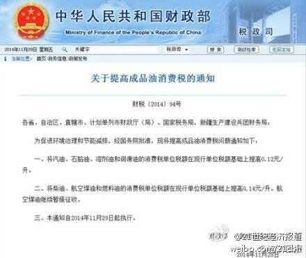 財政部、國家稅務總局于昨日晚間19時左右發(fā)布消息,11月29日起,提高成品油消費稅。其中,汽油消費稅單位稅額在現(xiàn)行單位稅額基礎上提高0.12元/升至1.12元/升。柴油消費稅單位稅額在現(xiàn)行單位稅額基礎上提高0.14元/升至0.94元/升。隨后,國家發(fā)改委也發(fā)布通知稱,因消費稅提高,油價不作調整。