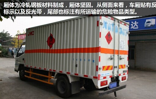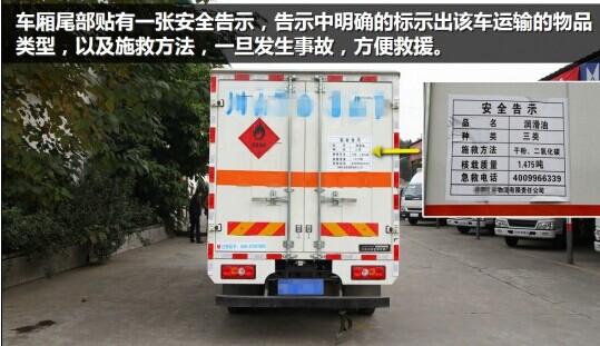 再來看看車廂,廂體為冷軋鋼板材料制成,廂體堅(jiān)固。從側(cè)面來看,車廂貼有反光標(biāo)示以及反光帶,在夜晚運(yùn)輸時(shí),有效提醒周圍車輛,同時(shí)也扯面和車尾部都標(biāo)注有所運(yùn)輸?shù)奈kU(xiǎn)物品類型。