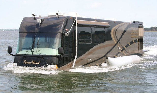 常見(jiàn)的水陸兩棲車(chē)以小車(chē)為主。但大型豪華房車(chē)水陸兩用就比較少見(jiàn)了。近日一輛水陸兩棲豪華房車(chē)亮相。