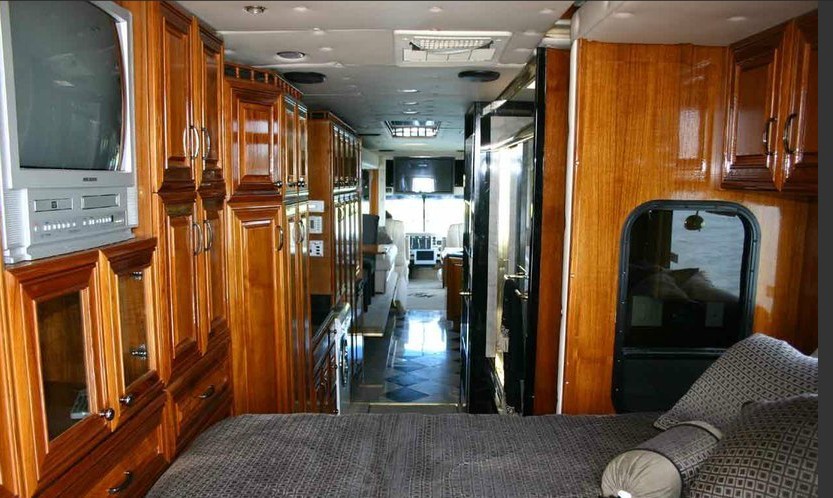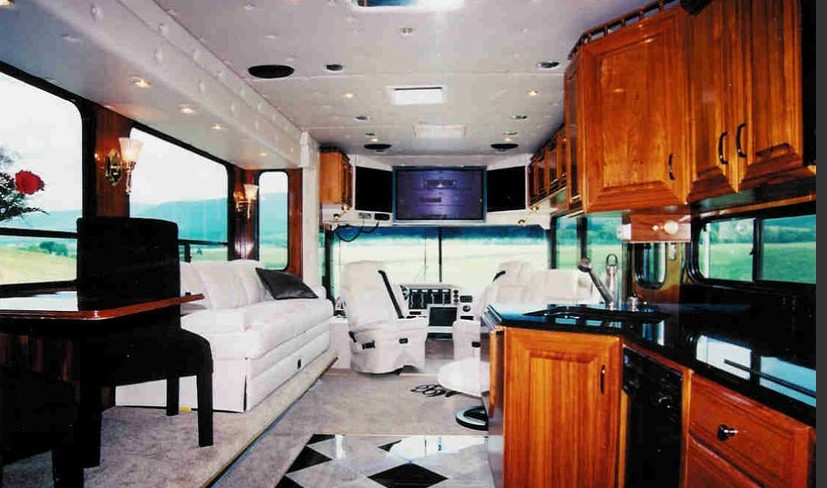 車(chē)內(nèi)沙發(fā)、電視、酒吧臺(tái)、床、娛樂(lè)設(shè)施一應(yīng)俱全,寬敞舒適。