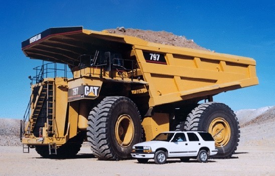 上圖是礦用翻斗車。和正常的城市旅行車對比就知道尺寸了。CAT卡特是是世界知名的工程機(jī)械廠家。