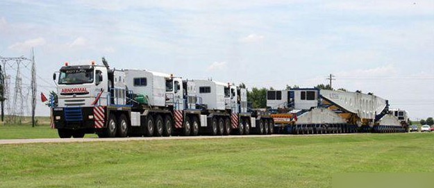 兩輛低平板半掛運(yùn)輸車并列才能拉起來。體積之大可見一斑。