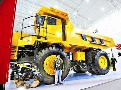 電影《變形金剛》中,霸天虎陣營(yíng)中有一個(gè)巨無霸機(jī)器人“大力神”,由于身形龐大,讓汽車人頗為頭疼。昨日車展現(xiàn)場(chǎng),一個(gè)尚未“變形”的大力神則讓現(xiàn)場(chǎng)觀眾狂呼過癮。這是由東風(fēng)(十堰)特種商用車有限公司打造的一款亮黃色的礦用自卸車?!皢慰催@個(gè)輪子都比我個(gè)頭要高?!编嵪壬砀?.85米,參加工作前曾在學(xué)校?;@球隊(duì)擔(dān)任主力,但當(dāng)他站到自卸車旁邊時(shí),卻連聲嘆氣說自己矮了?!败嚫?.5米,車輪直徑有1.9米?!睎|風(fēng)特種商用車公司主管工程師彭飛介紹,該車最大載重50噸,百公里油耗估計(jì)有90升。主要用于礦區(qū)作業(yè),市場(chǎng)售價(jià)約在250萬以上。