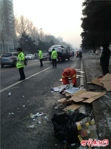 新文化記者趕到現(xiàn)場時,肇事的轎車已被拖到拖車上,被撞的手推車也固定在了拖車上。距離拖車不遠(yuǎn)的路面上,散落著大量紙殼、木板等物,一名環(huán)衛(wèi)工人正在收拾,幾名交警在維持附近的交通。