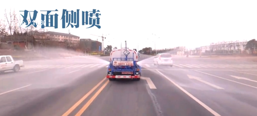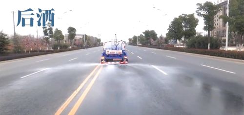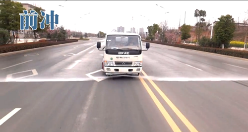 灑水車前沖(我們經(jīng)??吹綖⑺嚊_洗路面是從車前端下部,兩個(gè)噴頭對(duì)沖噴出高壓水柱,高壓水柱效果可以對(duì)沖三個(gè)車道左右)