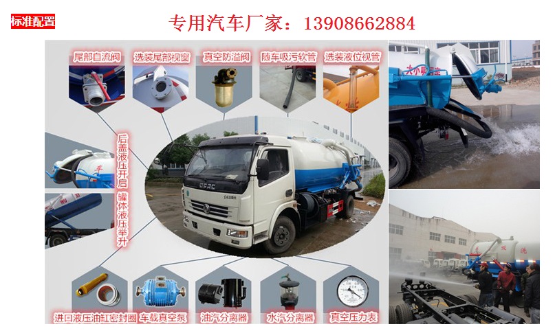 吸污車由取力器、傳動(dòng)軸、真空吸污泵、壓力罐體、液壓部分,管網(wǎng)系統(tǒng)、真空壓力表、視糞窗、洗手裝置等組成,隨車配置大功率真空吸污泵和優(yōu)質(zhì)液壓系統(tǒng),罐體封頭一次壓鑄成型、罐體可后開、雙頂自卸。