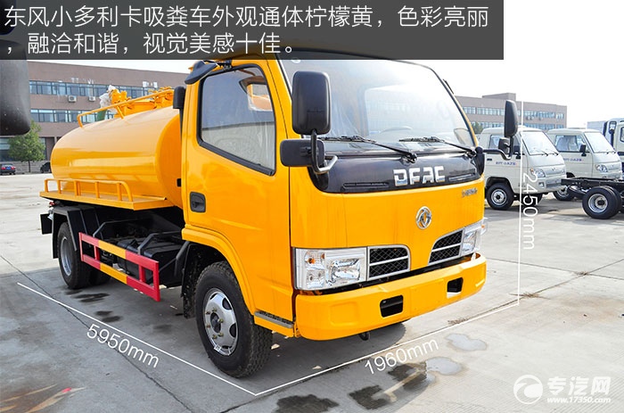 東風(fēng)小多利卡吸糞車外觀通體檸檬黃,色彩亮麗,融洽和諧,視覺美感十佳。整車的尺寸為5950×1960×2450mm。