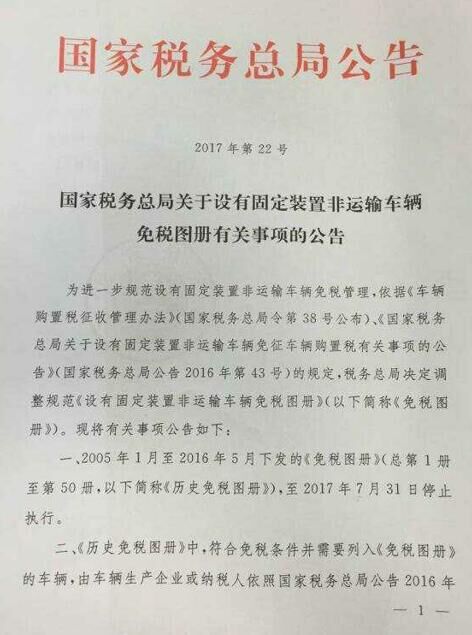 其實垃圾車等環(huán)衛(wèi)車的免征政策一直都在調整。從2005年6月30日“國稅函[2005]672號”《國家稅務總局關于設有固定裝置的非運輸車輛免征車輛購置稅的通知》開始,根據(jù)《中華人民共和國車輛購置稅暫行條列》第九條第三款“設有固定裝置的非運輸車輛,免稅”的規(guī)定,經總局審核確認,下列215種車型屬于設有固定裝置的非運輸車輛(詳見附件),同意免征車輛購置稅。這一免征整車延續(xù)11年后,由于實際用車環(huán)境的變化,尤其是環(huán)衛(wèi)車用戶從政府部門,事業(yè)單位,環(huán)衛(wèi)處逐步變成物業(yè)公司,清潔公司,環(huán)衛(wèi)公司或者個人,國稅總局在2016年6月30日發(fā)文調整了這一政策。國家稅務總局公告2016年第43號《關于設有固定裝置非運輸車輛免征車輛購置稅有關事項的公告》就作出以下調整: