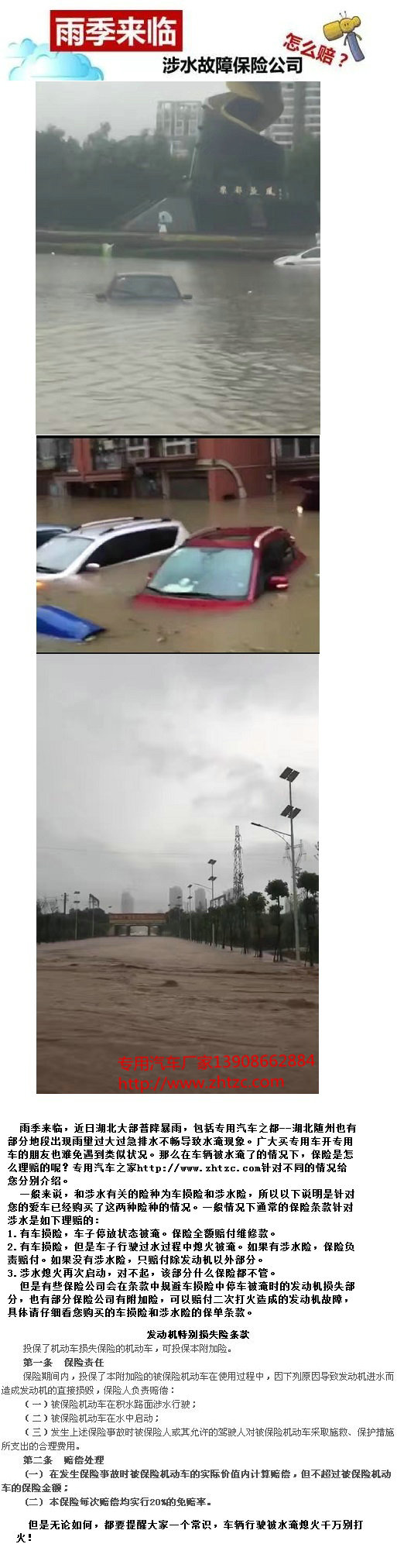 雨季來(lái)臨,近日湖北大部普降暴雨,包括專用汽車(chē)之都--湖北隨州也有部分地段出現(xiàn)雨量過(guò)大過(guò)急排水不暢導(dǎo)致水淹現(xiàn)象。廣大買(mǎi)專用車(chē)開(kāi)專用車(chē)的朋友也難免遇到類似狀況。那么在車(chē)輛被水淹了的情況下,保險(xiǎn)是怎么理賠的呢?專用汽車(chē)之家http://www.xledu.com.cn針對(duì)不同的情況給您分別介紹。