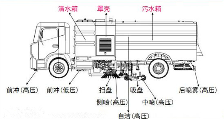 更簡單的說就是,洗掃車比掃路車多加裝一個高壓水泵,加大了水箱容積,加大了副發(fā)動機(jī)馬力。