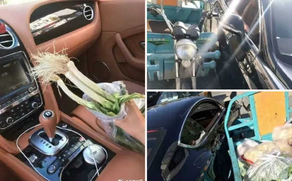 這輛黑色的賓利車在路上被一輛三輪車撞了,大爺?shù)狼福盒』镒樱屹r償你吧,一把蔥行嗎?賓利車主答復(fù):不用了,下次您慢點騎。最后,大爺還是從副駕車窗扔進來一袋蔥…