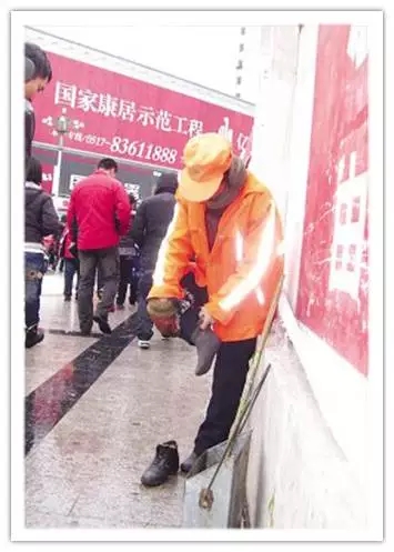 4,42歲的女環(huán)衛(wèi)工孫美蘭,已經連續(xù)4天在她的轄區(qū)內清掃積雪,而當天她已是第三次更換被雪水浸濕的襪子了。