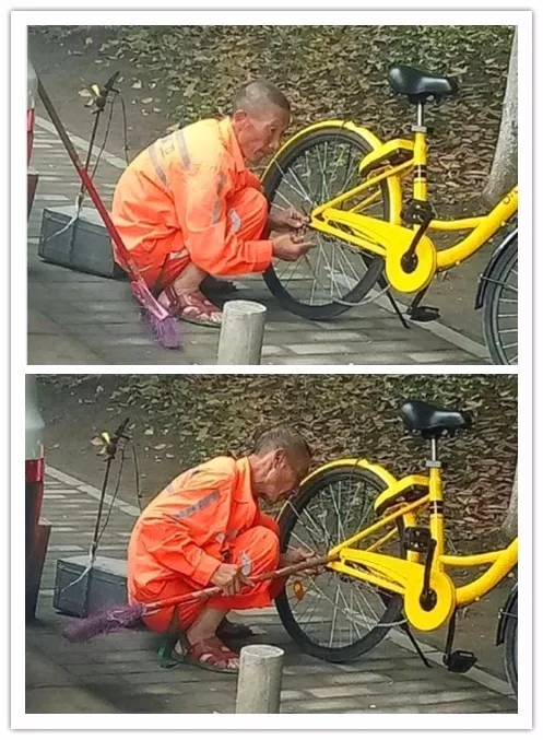 12網友拍到的一幕:成都街邊一環(huán)衛(wèi)大爺正在給共享單車上鏈條。