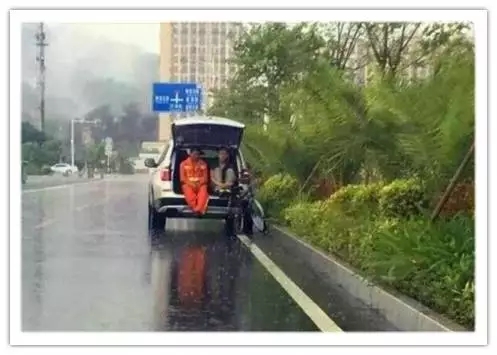 13這是路過司機拍下的一幕:廣東珠海突降暴雨,一名環(huán)衛(wèi)工無處避雨。民警張先生駕車經過,他停下車,對環(huán)衛(wèi)工說:“快上車,我送你回去”。“不行,我還沒有掃完路,而且單車也放不進去”。于是出現(xiàn)這一幕:張先生打開后尾箱蓋,陪著他一起避雨……
