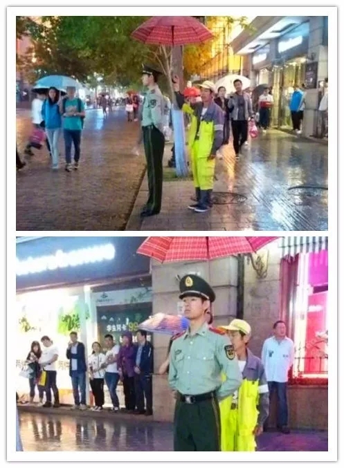 14哈爾濱中央大街上,一名武警戰(zhàn)士在路邊站崗,突然降下大雨。行人紛紛避雨或撐起雨具,這時一名環(huán)衛(wèi)工人,出現(xiàn)在了武警戰(zhàn)士的身后,伸長手臂,把雨傘打在了他的頭頂?;蛟S,戰(zhàn)士已經在雨中站了很長時間;或許,環(huán)衛(wèi)大哥已經勞累了一整天。