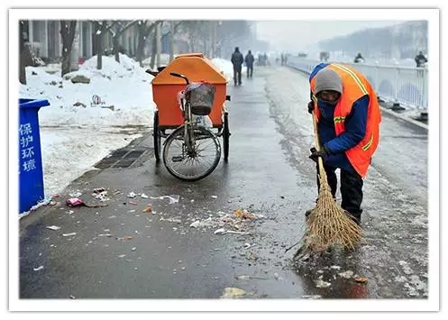17據央視報道,我國目前環(huán)衛(wèi)工中有八成為臨時工,他們的工資不到全國城鎮(zhèn)在崗職工月平均工資的一半。2012年12月28日,河南省遂平縣建設路,78歲的張秀榮在冰天雪地里打掃衛(wèi)生。她從1976年就開始做環(huán)衛(wèi)工,已經干了36年,一直都是臨時工身份,沒有社保和醫(yī)保。
