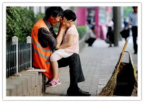 2011年5月7日,江蘇徐州煤建路,一清潔工人坐在路邊摟著自己的孫女嬉笑。當日正值周六,小孫女不上學,來到路邊尋找爺爺。女孩的父母在北京打工,小孫女從小隨著爺爺奶奶生活。這張照片曾在網絡上走紅,而在第二年4月,這位老人因患惡性淋巴腫瘤去世。