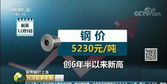 11月以來(lái),鋼價(jià)淡季不淡,反而走出了一路上揚(yáng)的態(tài)勢(shì),截至12月5日,鋼價(jià)達(dá)到每噸5230元,創(chuàng)下6年半以來(lái)的新高,鋼材的價(jià)格指數(shù)比去年同期已經(jīng)上漲超過(guò)了50%。上漲的主要原因有哪些呢?上海市寶山區(qū)的共悅路上,運(yùn)輸鋼材的車(chē)輛來(lái)來(lái)往往。這條路上有好幾家鋼材加工廠,是鋼材運(yùn)輸?shù)闹鞲傻馈T谝患忆摬募庸S的門(mén)口,記者見(jiàn)到了正把鋼材送到這里加工的鄒先生,他告訴記者,最近一段時(shí)間,鋼廠的訂單都很滿,市場(chǎng)上一些規(guī)格的鋼材甚至出現(xiàn)斷貨。