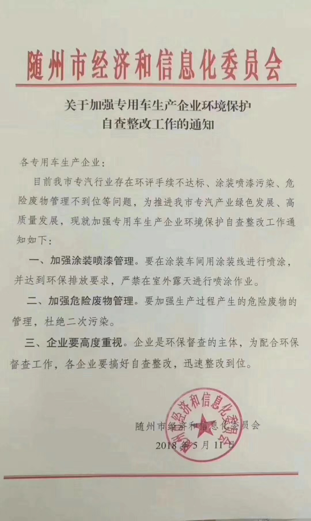 目前隨州的專用汽車油漆都在整改,必然給現(xiàn)有的訂單交期帶來(lái)一定的影響。希望廣大客戶不要著急,我們會(huì)盡快升級(jí)設(shè)備,及時(shí)處理環(huán)保組的意見(jiàn),爭(zhēng)取早日恢復(fù)正常的油漆噴涂生產(chǎn),早日交車。