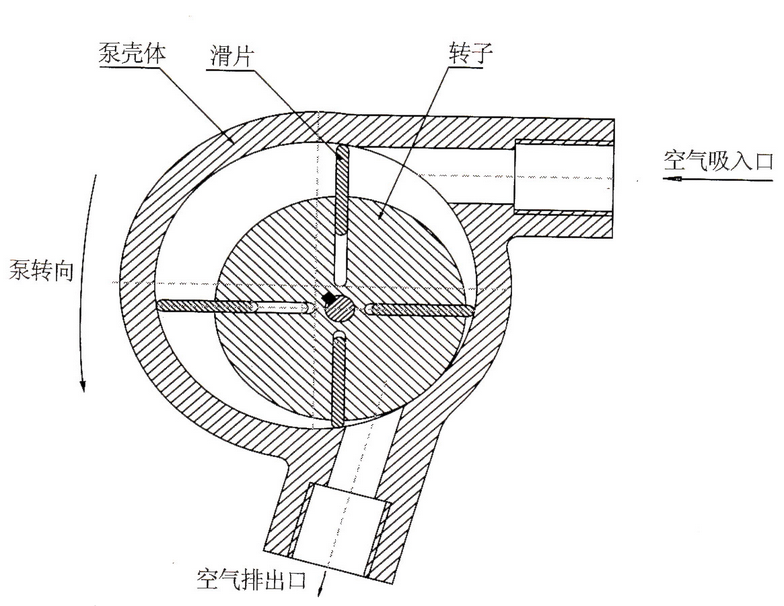 刮片泵主要由泵體、轉(zhuǎn)子、刮片、端蓋、彈簧等組成。在刮片泵的腔內(nèi)偏心地安裝一個轉(zhuǎn)子,轉(zhuǎn)子外圓與泵腔內(nèi)表面相切(二者有很小的間隙),轉(zhuǎn)子槽內(nèi)裝有帶彈簧的二個刮片。旋轉(zhuǎn)時,靠離心力和彈簧的張力使刮片頂端與泵腔的內(nèi)壁保持接觸,轉(zhuǎn)子旋轉(zhuǎn)帶動刮片沿泵腔內(nèi)壁滑動。