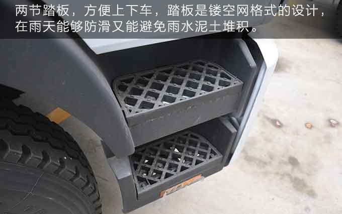 首先,進入視線的是東風(fēng)多利卡D9吸污車駕駛室的兩節(jié)踏板,因為這款吸污車的底盤比較高,為了方便上下車,所以設(shè)計了兩節(jié)踏板,且踏板是鏤空網(wǎng)格式的設(shè)計,在雨天能夠防滑又能避免雨水泥土堆積。
