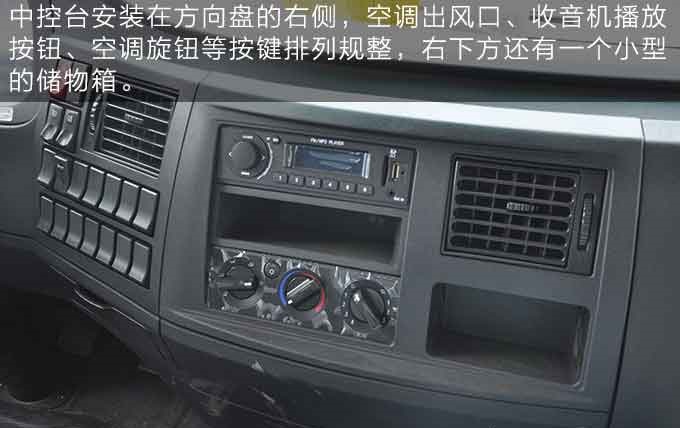 中控臺安裝在方向盤的右側(cè),空調(diào)出風(fēng)口、收音機播放按鈕、空調(diào)旋鈕等按鍵排列規(guī)整,右下方還有一個小型的儲物箱。
