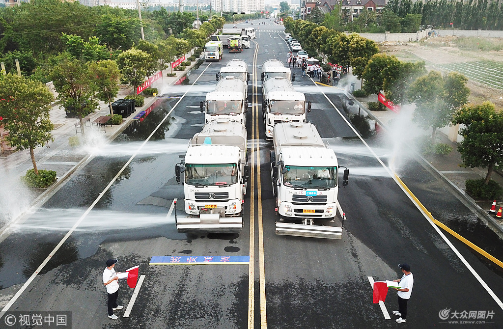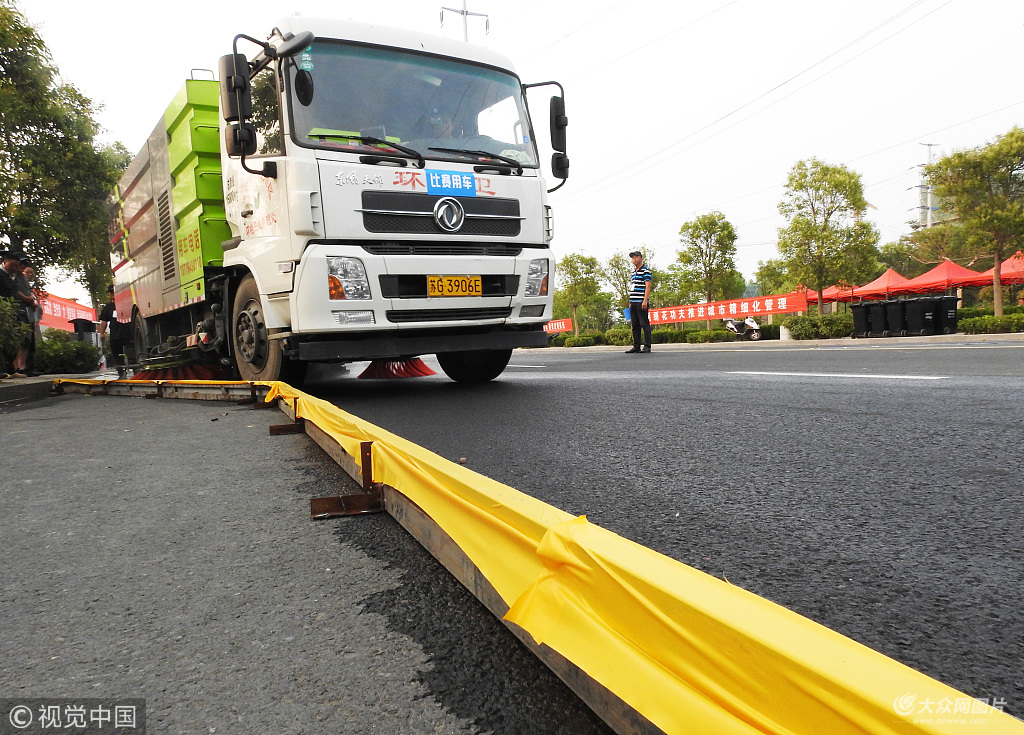 當(dāng)日,江蘇連云港市海州區(qū)舉辦首屆環(huán)衛(wèi)工人技能展示活動,50多名“城市美容師”分別在道路機械化沖洗、機械化清掃、電動垃圾車收集、壓縮垃圾車收集、慢車道清掃、人工清掃等6個作業(yè)項目上秀出絕活,展示標(biāo)準(zhǔn)化、精細(xì)化環(huán)衛(wèi)作業(yè)方式。2018年6月8日,江蘇連云港,環(huán)衛(wèi)工人在展示道路機械化沖洗技能。圖片作者:耿玉和/視覺中國