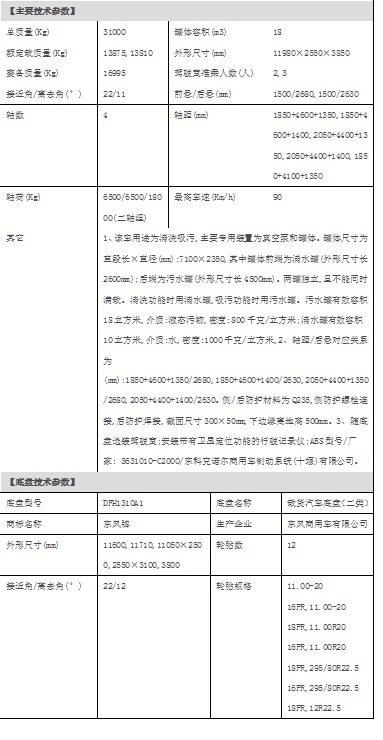 上裝:吸污罐體18立方,采用8mm厚碳鋼材質制作,帶真空吸污泵,視污窗,水油分離器,自流口,防溢閥,后門液壓自卸功能,清洗罐體10立方,帶高壓泵,60米高壓沖洗管和卷盤,10個噴頭,