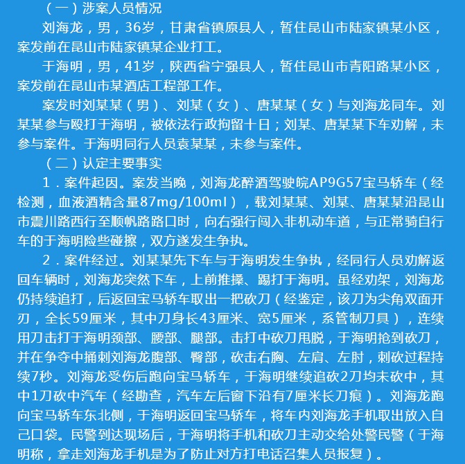 2018年8月27日21時(shí)30分許,劉海龍駕駛寶馬轎車(chē)在昆山市震川路西行至順?lè)仿房?,與同向騎自行車(chē)的于海明發(fā)生爭(zhēng)執(zhí)。劉海龍從車(chē)中取出一把砍刀連續(xù)擊打于海明,后被于海明反搶砍刀并捅刺、砍擊數(shù)刀,劉海龍身受重傷,經(jīng)搶救無(wú)效死亡。