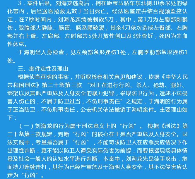 3。案件后果。劉海龍?zhí)与x后,倒在距寶馬轎車(chē)東北側(cè)30余米處的綠化帶內(nèi),后經(jīng)送醫(yī)搶救無(wú)效于當(dāng)日死亡。經(jīng)法醫(yī)鑒定并結(jié)合視頻監(jiān)控認(rèn)定,在7秒時(shí)間內(nèi),劉海龍連續(xù)被刺砍5刀,其中,第1刀為左腹部刺戳傷,致腹部大靜脈、腸管、腸系膜破裂;其余4刀依次造成左臀部、右胸部并右上臂、左肩部、左肘部共5處開(kāi)放性創(chuàng)口及3處骨折,死因?yàn)槭а孕菘恕?/FONT>