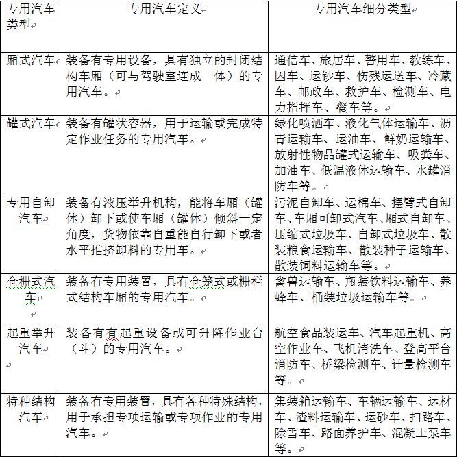 GB/T 17350-1998還將國(guó)產(chǎn)專用汽車劃分為廂式汽車、罐式汽車、專用自卸汽車、超重舉升汽車和特種結(jié)構(gòu)汽車等六大類