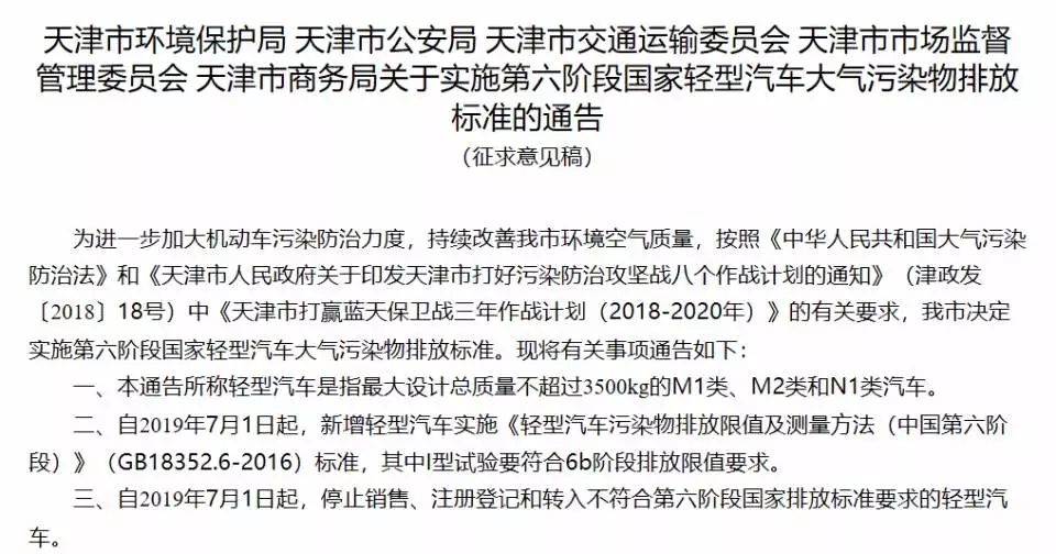 天津:11月28日,天津市環(huán)保局、公安局等多部委聯(lián)合發(fā)布了有關(guān)“國(guó)六”政策的《征求意見(jiàn)稿》,意見(jiàn)指出:“國(guó)六”排放標(biāo)準(zhǔn)計(jì)劃自2019年7月1日起實(shí)施,但該通告目前仍處于意見(jiàn)征集階段,這意味著天津?qū)嵤皣?guó)六”不會(huì)早于2019年7月1日。