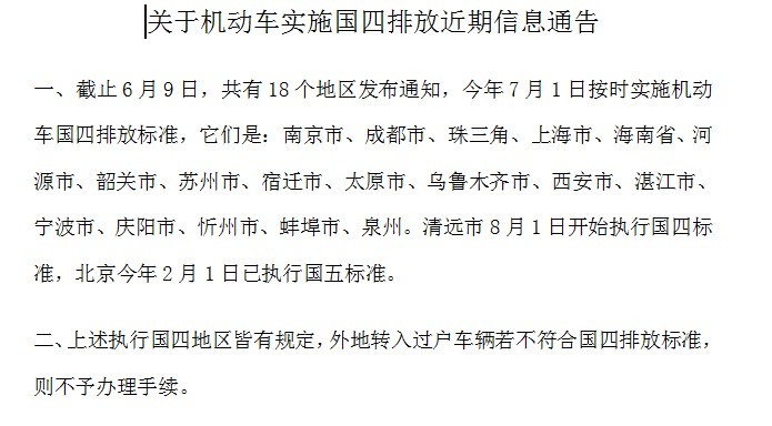 工信部通知7月1日起停止國3車新公告申報(bào),環(huán)保部表態(tài)7.1按期實(shí)施,已宣布7.1號按期實(shí)施國四(包括注冊,轉(zhuǎn)入)的地方政府有北京、上海、杭州、南京、蚌埠、泉州、廣州、深圳、湛江、清遠(yuǎn)、河源、海南、成都、雅安、西安、蘭州、慶陽、烏魯木齊總共18個(gè)區(qū)域。