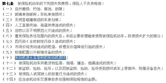 除發(fā)動(dòng)機(jī)損壞外,商業(yè)車損險(xiǎn)均可賠償。其中責(zé)任免除條款如下: