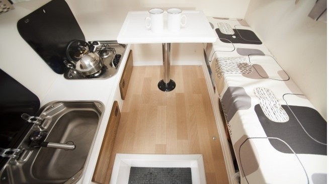 車內(nèi)有水槽,龍頭,燃?xì)庠睿妥篮蜕嘲l(fā)。餐桌可以當(dāng)作書桌使用,沙發(fā)可以當(dāng)作單人床使用。