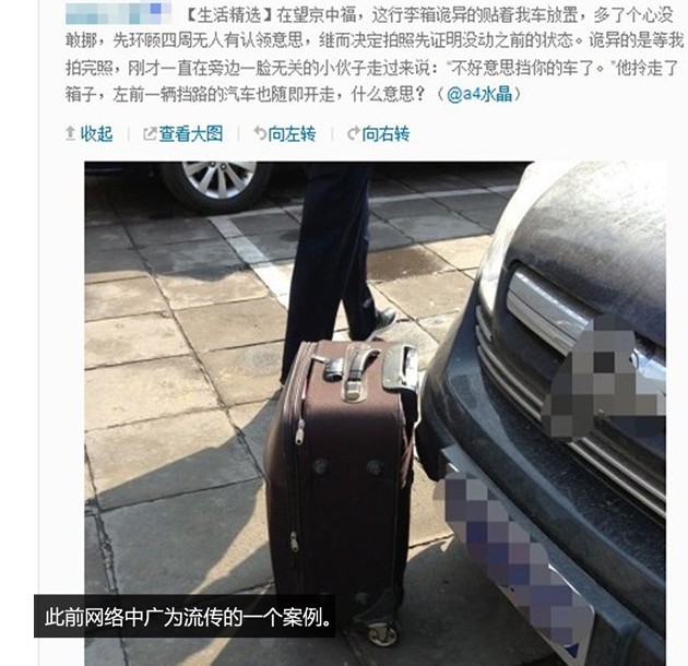 這是發(fā)生在今年年初的一個(gè)事件,一位網(wǎng)友在準(zhǔn)備駕車外出時(shí)發(fā)現(xiàn)車前放置了一個(gè)行李箱,周圍也沒有人認(rèn)領(lǐng),車主多了個(gè)心眼先拍照留證據(jù)。此時(shí)旁邊走來一名男士,表示自己箱子擋住了該網(wǎng)友的車,表示歉意后將箱子拎走。